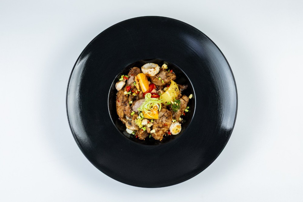 Курка су-від, гриби, перець болгарський, цибуля порей, рис паровий, масло вершкове, паста карі, соус вершковий, лимон, кінза, чілі