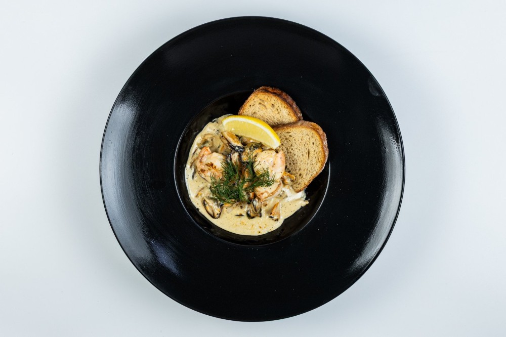Креветка очищена, філе мідій, соус вершковий, вино сухе, часник, олія, сіль, перець чорний, кріп, лимон, цільнозерновий хліб
