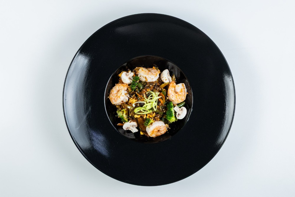 Креветки очищені, овочевий мікс (болгарський перець, печериці, морква, спаржева квасоля, броколі), соус тонкацу, кунжут білий, цибуля порей, лимон, куряче яйце, фурікаке, чорний молотий перець, олія