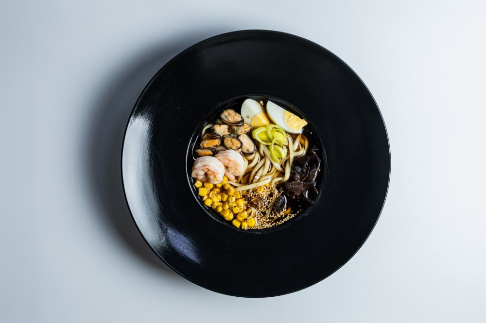 Бульйон рамен, креветки очищені, філе мідій, яйце куряче, гриби муер, локшина пшенична, цибуля порей, фурікаке(кунжут,стружка тунця,норі), кукурудза