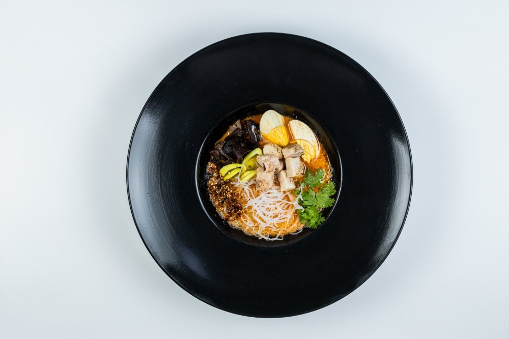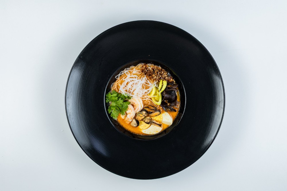 Бульйон том-ям, курка су-від, локшина скляна, яйце куряче, цибуля порей, гриби муер, фурікаке(кунжут,стружка тунця,норі), кінза