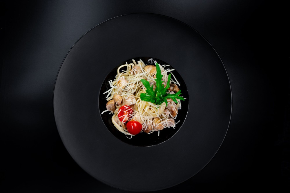 Локшина удон, курка су-від, печериці, соус вершковий, пармезан, рукола, чері, часник, чорний перець, олія