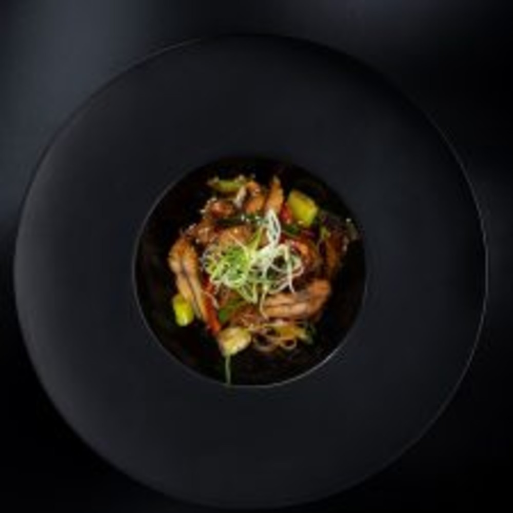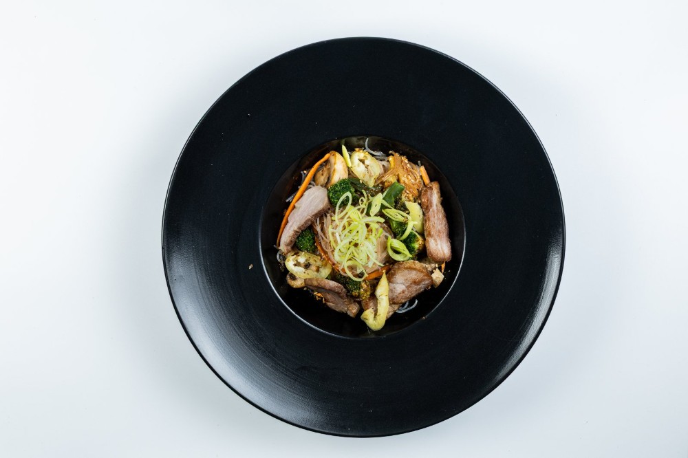 Локшина удон, свинина су-від, мікс овочів ( болгарський перець, печериці, морква, спаржева квасоля, броколі,), фурікаке ( кунжут, стружка тунця, норі), соус теріякі, соєвий соус, цибуля порей, чорний перець, олія