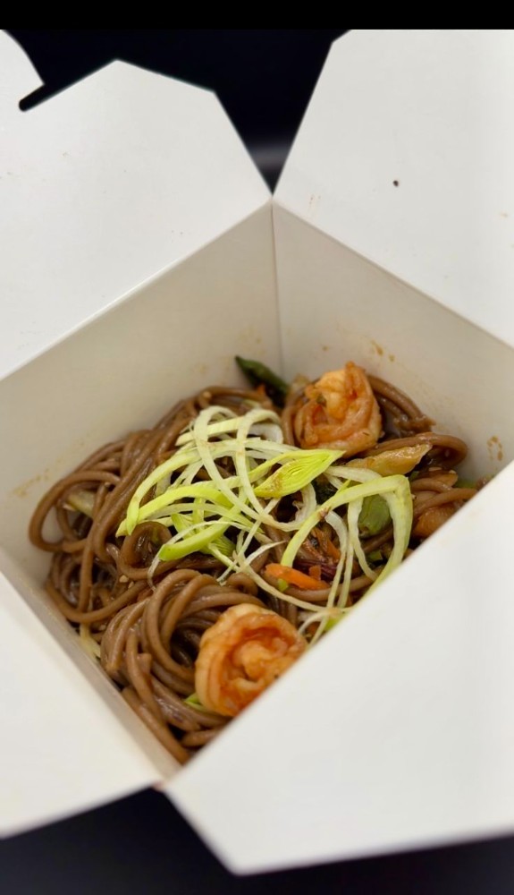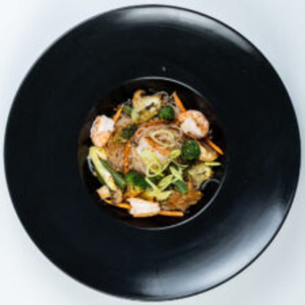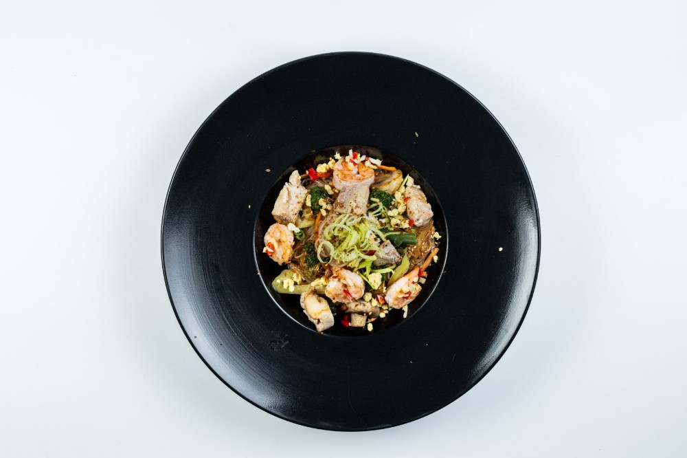 Локшина Харусаме, курка су-від, креветка очищена, китайський соус, соєвий соус, яйце куряче, овочевий мікс (болгарський перець, печериці, морква, спаржева квасоля, броколі,), китайська суміш, фурікаке(кунжут,стружка тунця,норі), цибуля порей