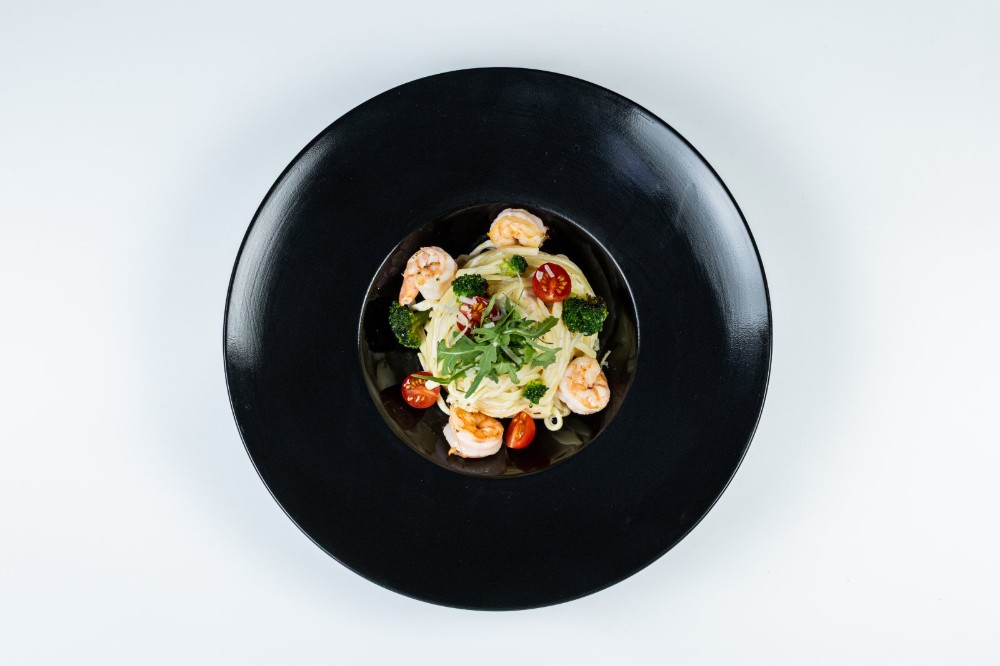 Локшина удон, креветки, соус вершковий, пармезан, рукола, чері, броколі, часник, лимон, чорний перець, сіль, олія
