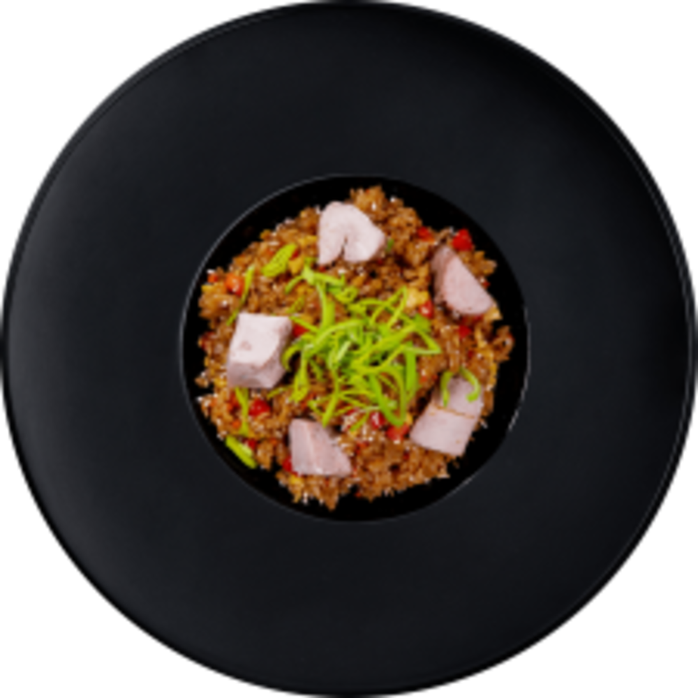 Рис паровий, свинина су-від, соєвий соус, яйце куряче, перець болгарський, морква, часник, цибуля порей, фурікаке ( кунжут, стружка тунця, норі), перець чорний, олія