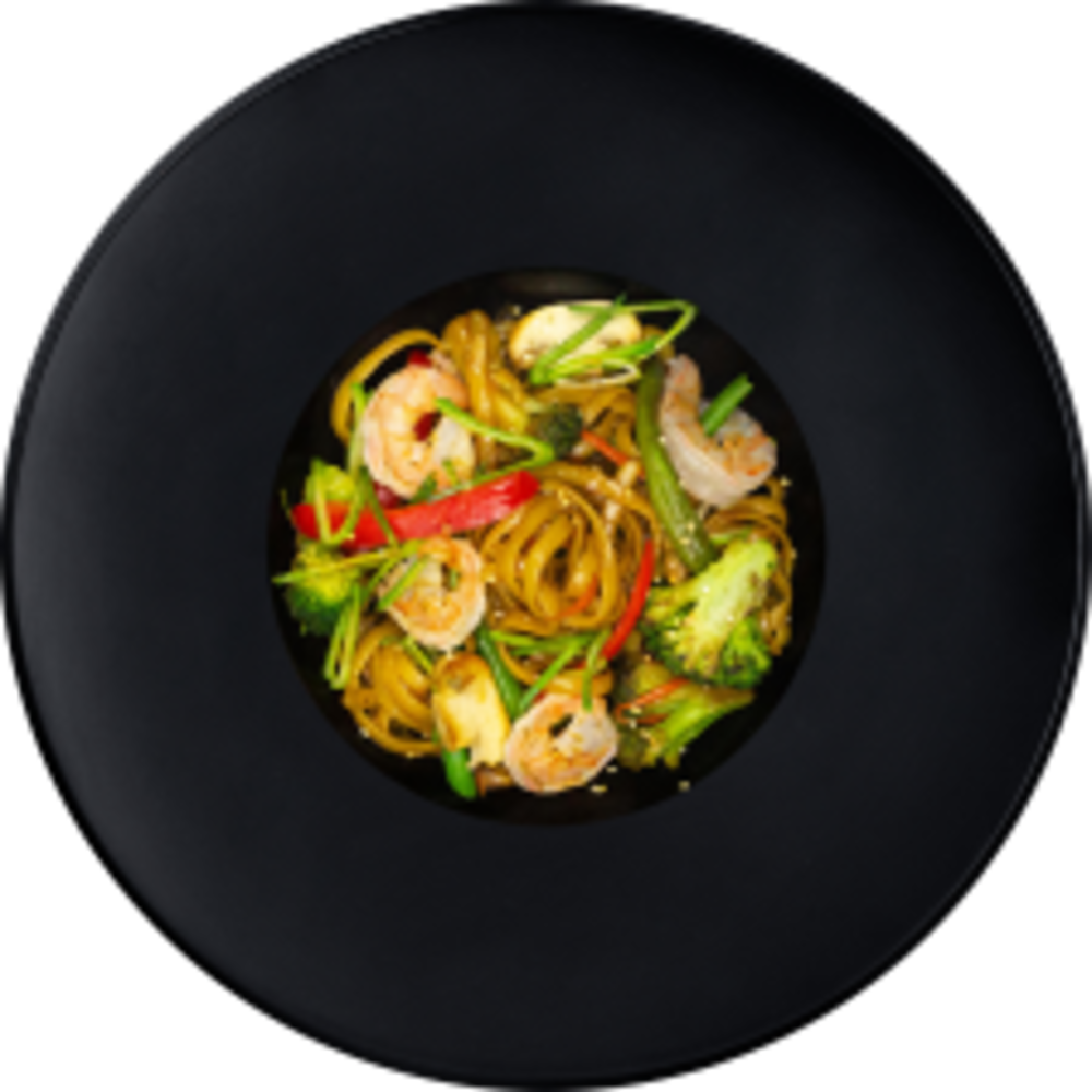 Локшина удон, креветки, мікс овочів ( болгарський перець, печериці, морква, спаржева квасоля, броколі,), фурікаке ( кунжут, стружка тунця, норі), соус теріякі, соєвий соус, цибуля порей, чорний перець, лимон, олія