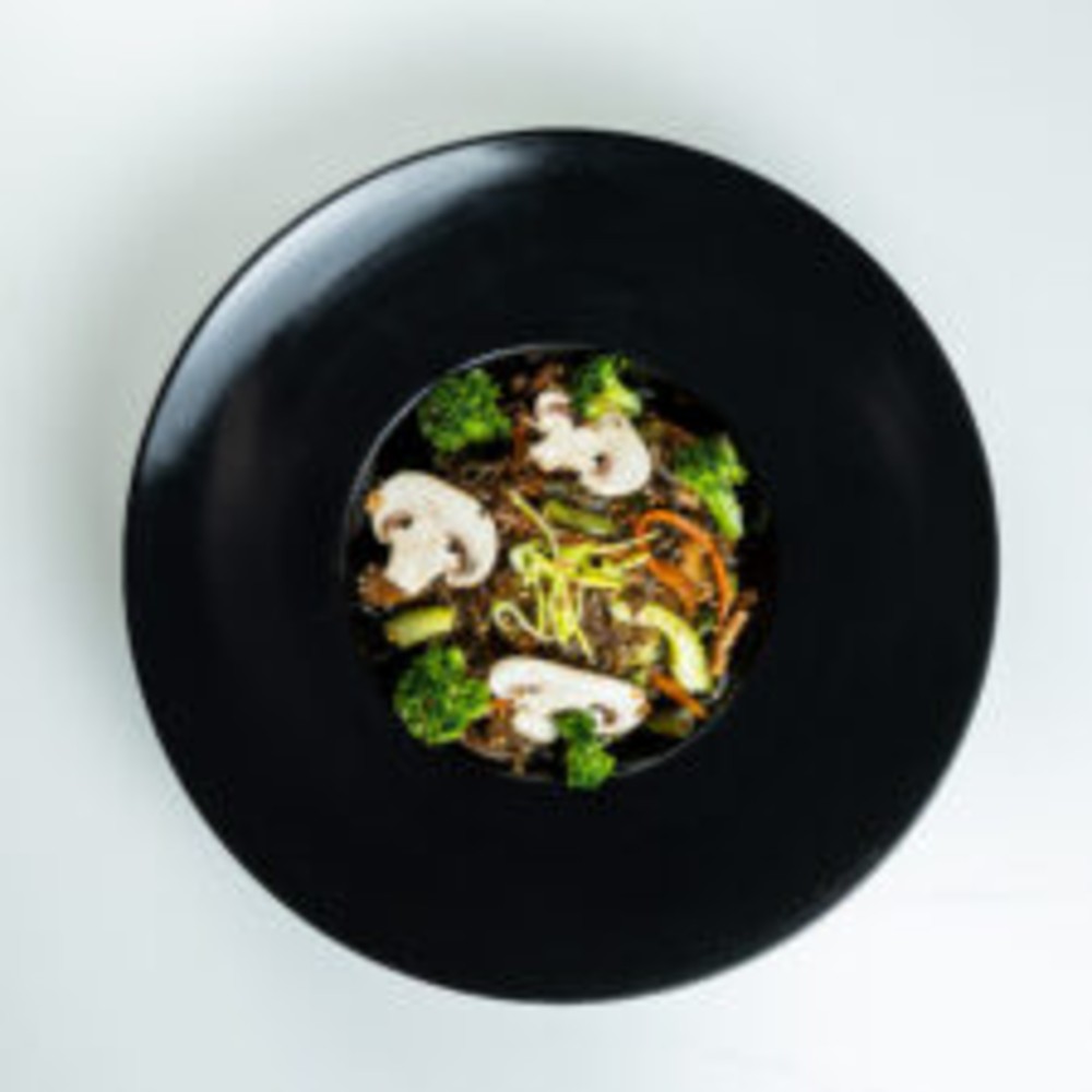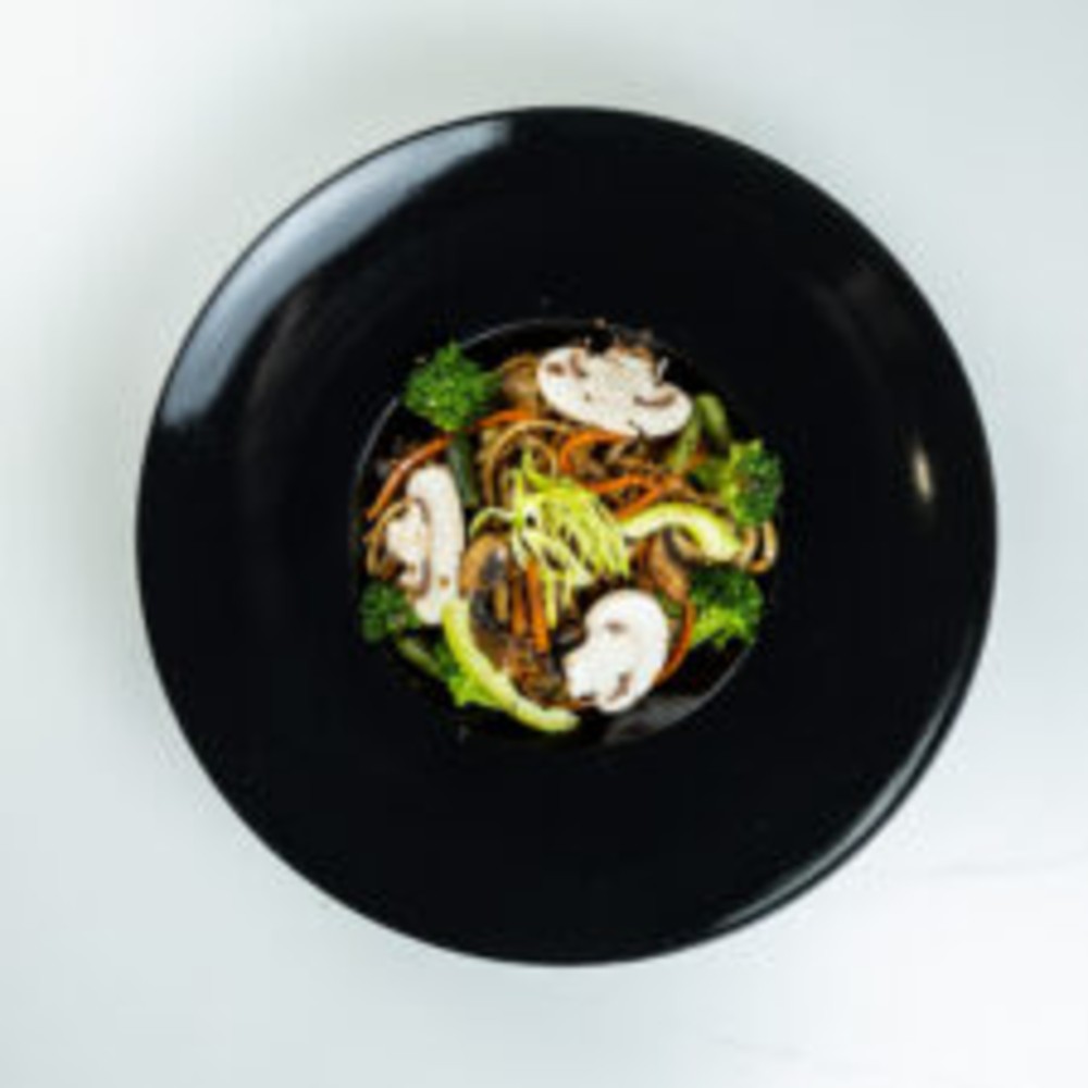 Локшина удон, овочевий мікс (болгарський перець,печериці, морква, спаржева квасоля, броколі), соєвий соус, кунжут, цибуля порей