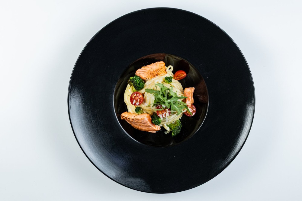Локшина удон, лосось, вершковий соус, броколі, пармезан, помідори чері, рукола, часник, лимон, чорний перець, олія