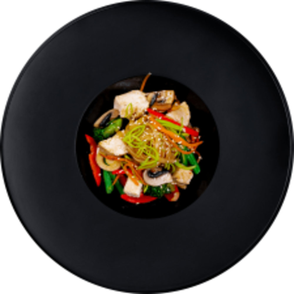 Локшина Харусаме, (болгарський перець,печериці, морква, спаржева квасоля, броколі, ), соєвий соус, кунжут