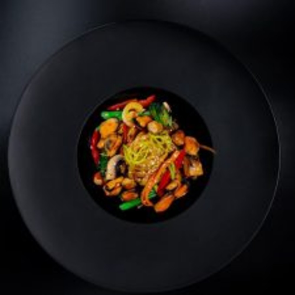Локшина удон, мідії, мікс овочів ( болгарський перець, печериці, морква, спаржева квасоля, броколі), фурікаке ( кунжут, стружка тунця, норі), соус теріякі, соєвий соус, цибуля порей, чорний перець, лимон, олія