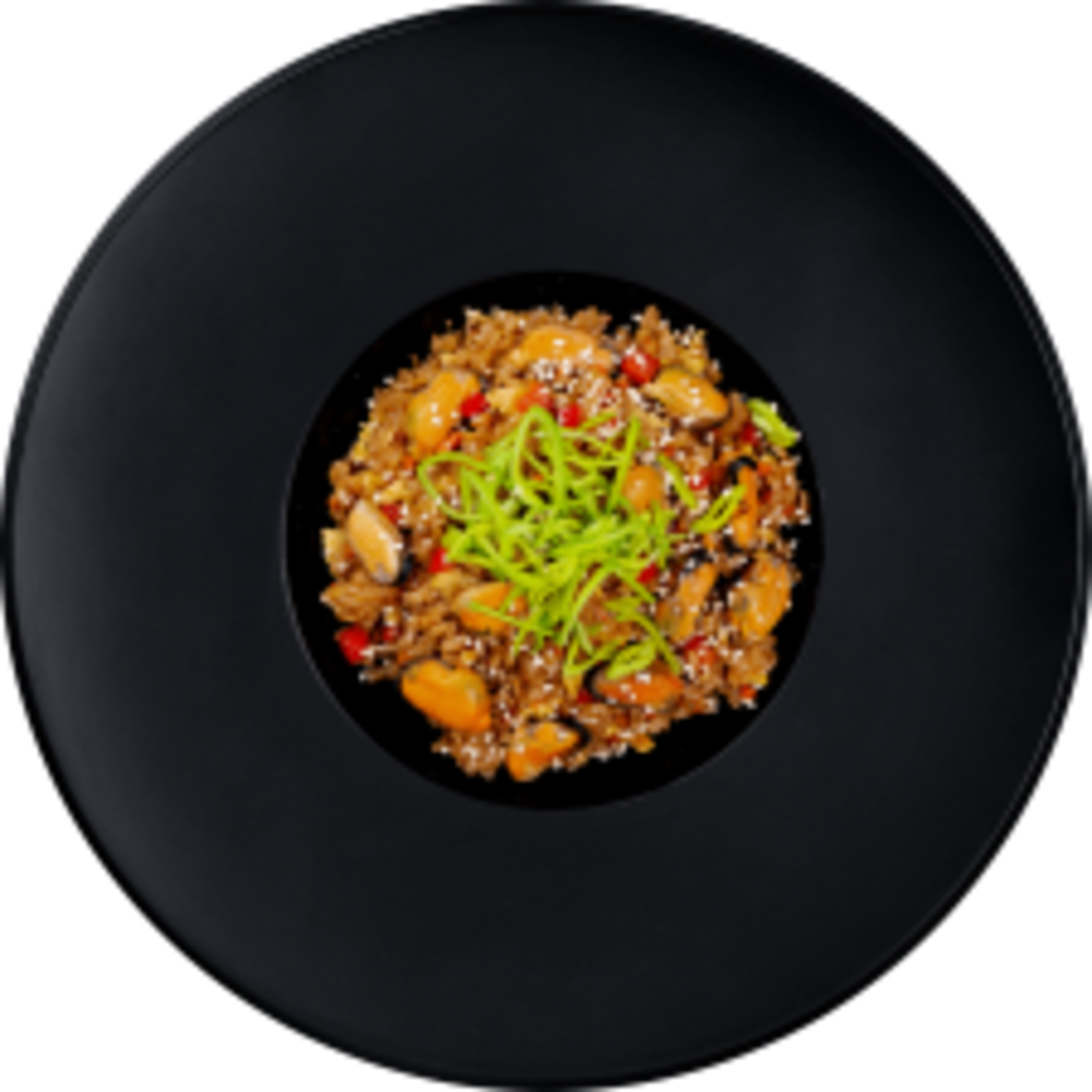 Рис паровий, мідії, соєвий соус, яйце куряче, перець болгарський, морква, часник, цибуля порей, фурікаке ( кунжут, стружка тунця, норі), лимон, перець чорний, олія