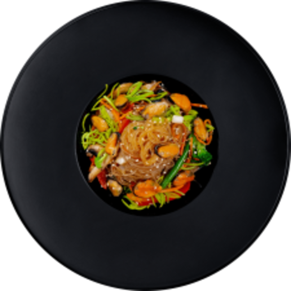 Локшина Харусаме, мідії, мікс овочів (болгарський перець,печериці, морква, спаржева квасоля, броколі,) фурікаке (кунжут, стружка тунця, норі), соус тонкацу, соєвий соус, чорний перець, лимон, олія